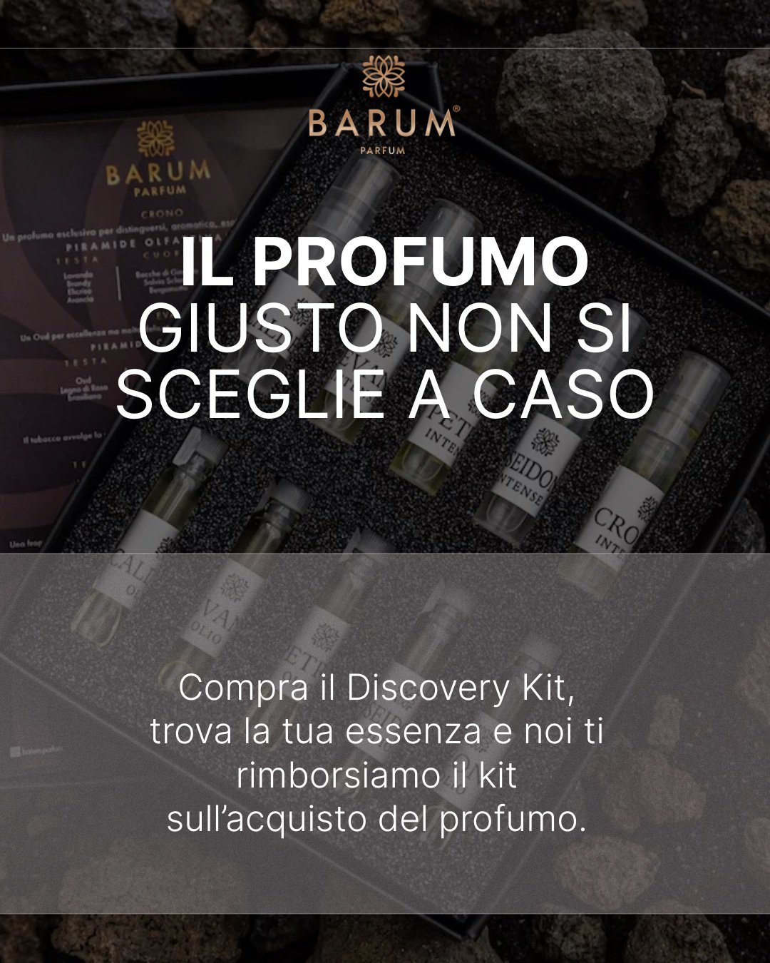 Immergiti nel mondo olfattivo di Barum Parfum con il nostro esclusivo Discovery Kit: un elegante cofanetto che ti permette di provare diverse fragranze e trovare quella che racconta davvero chi sei. All’interno troverai una selezione di campioncini delle nostre essenze artigianali, per sperimentare ogni profumo e lasciarti ispirare dalle note uniche che lo compongono